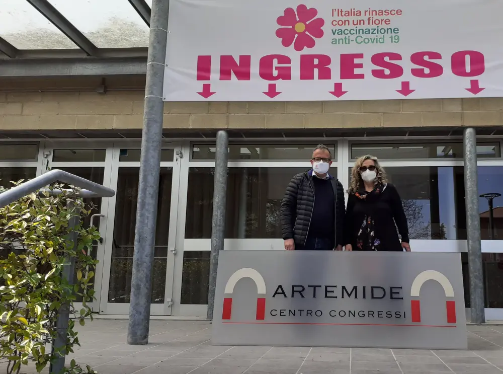 Il sindaco Fausto Tinti e Luisa Tosoni, proprietaria del Centro Congressi Artemide-Hotel Castello, davanti all'ingresso del nuovo punto vaccinale