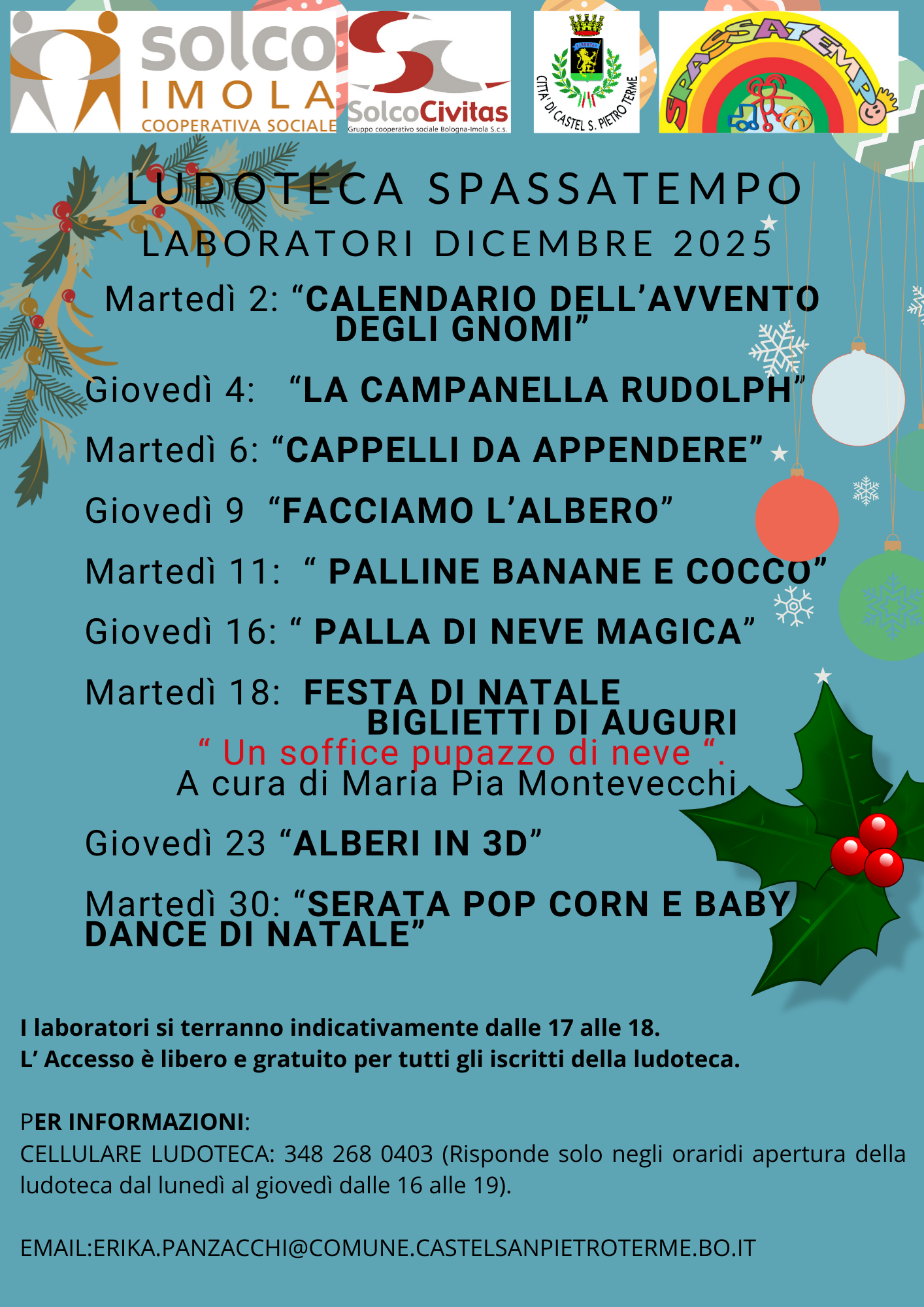 La Ludoteca Comunale Spassatempo, in collaborazione con Solco Imola e Solco Civitas presenta il ricco calendario di attività creative per il mese di dicembre 2025. Una proposta pensata per accompagnare i bambini verso il Natale con laboratori divertenti e momenti di condivisione.