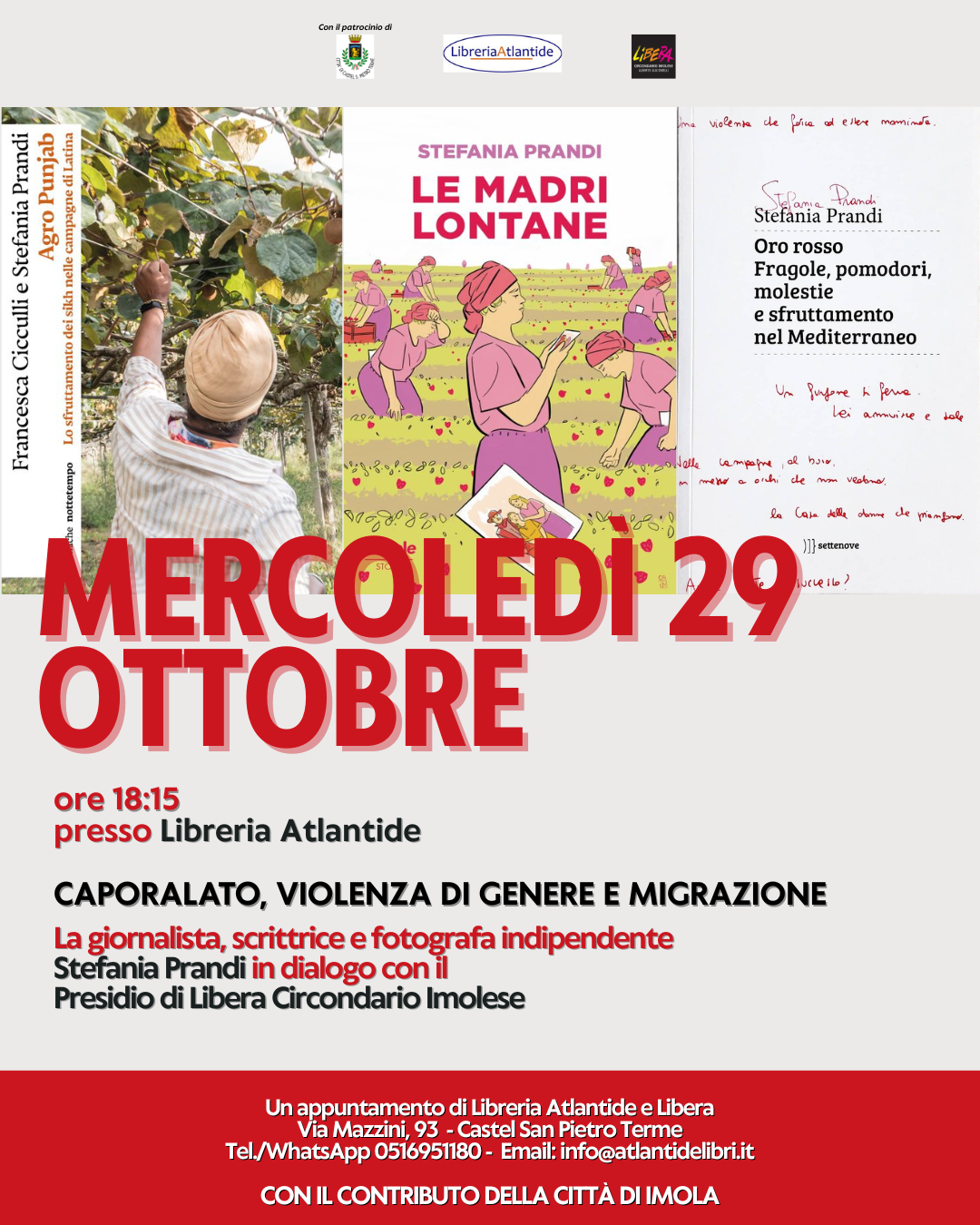 Mercoledì 29 ottobre alle ore 18.15, la libreria Atlantide di Castel San Pietro ospiterà Stefania Prandi, giornalista, scrittrice e fotografa indipendente, per un incontro dal titolo Caporalato, violenza di genere e migrazione. In dialogo con il Presidio di Libera contro le mafie del Circondario Imolese. Evento in collaborazione con il Presidio di Libera del Circondario Imolese e con il patrocinio del Comune di Castel S. Pietro Terme.
