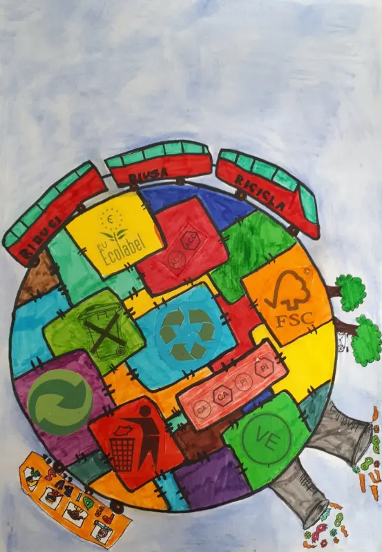 Un colorato pianeta Terra tappezzato con i simboli del riciclo è il soggetto del disegno della classe terza B della Scuola primaria Sassatelli scelto per la locandina della 16a edizione del Carnevale di Castel San Pietro Terme, un'edizione intitolata “Carnevale nel pianeta da salvare” e dedicata altema sull'ambiente, principale emergenza del nostro tempo.