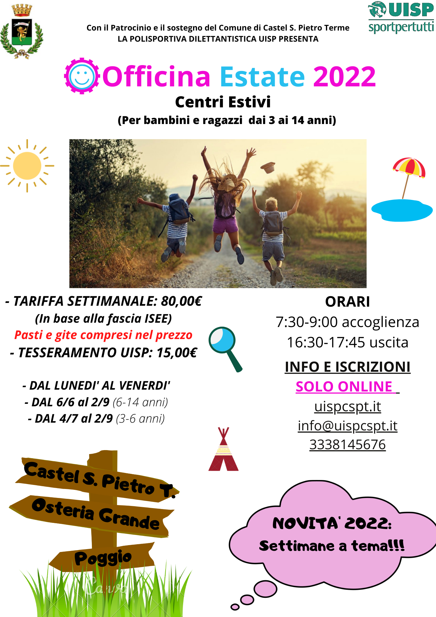 La fine della scuola si avvicina ed è ormai tempo per le famiglie di iscrivere bambini e ragazzi a “Officina Estate”, i centri estivi organizzati dalla Polisportiva Dilettantistica Uisp, con il patrocinio dell'Amministrazione Comunale di Castel San Pietro Terme e la collaborazione di diverse associazioni sportive, sociali e culturali del territorio.
