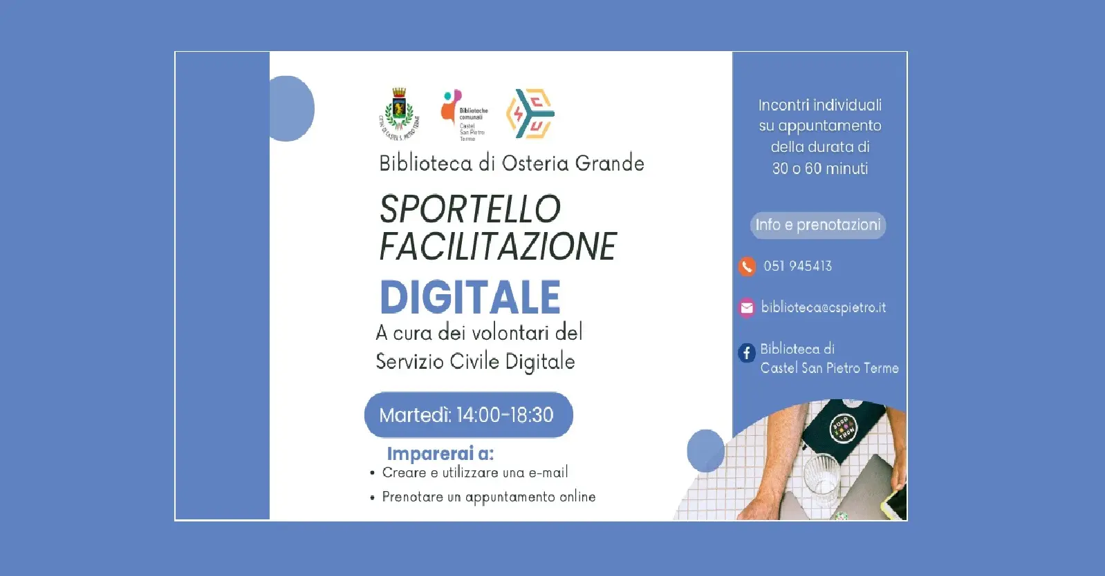 Da martedì 11 marzo è attivo alla Biblioteca di Osteria Grande in via Broccoli 41 lo Sportello per la facilitazione digitale, un servizio gratuito su appuntamento, disponibile grazie ai volontari del Servizio Civile Digitale che forniscono assistenza ai cittadini per imparare l’uso delle nuove tecnologie.