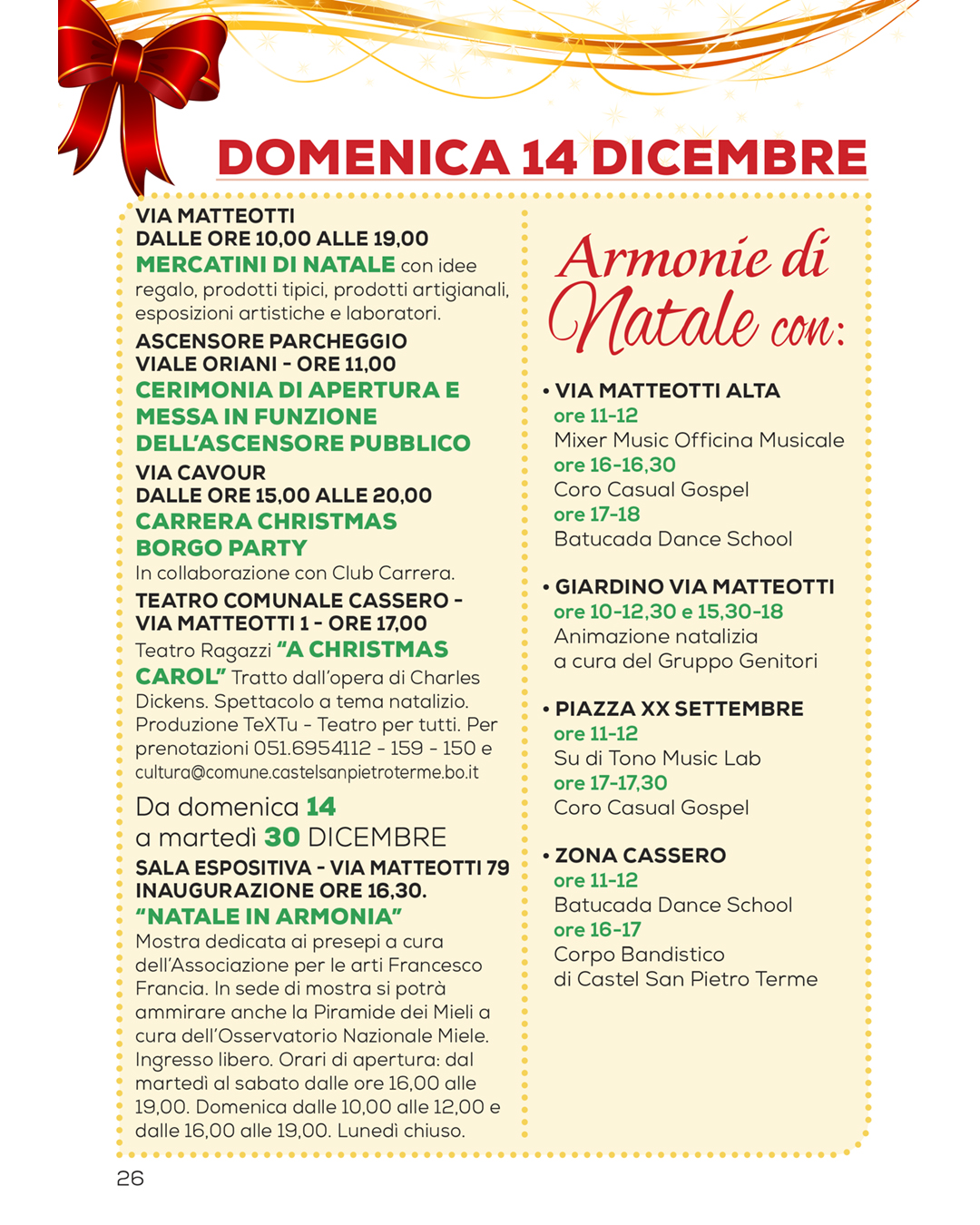 In piazza XX Settembre, dalle 11 alle 12 ci sarà il concerto di Natale degli allievi di canto, pianoforte e voci fuori dal coro a cura dell’insegnante Morena Vasile di Su di Tono Music Lab, mentre il concerto di musica e canzoni in compagnia di Variabili Costanti e Mima (Daniela, Giulia, Michela) tornerà dalle 17 alle 17.30 con una speciale performance natalizia. Nella zona del Cassero, la mattinata sarà animata dalla Batucada Dance School dalle 11 alle 12, mentre nel pomeriggio, dalle 16 alle 17, si esibirà il Corpo Bandistico di Castel San Pietro Terme, offrendo un momento particolarmente suggestivo della tradizione musicale cittadina.