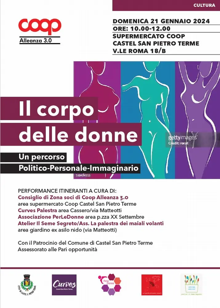 Domenica 21 gennaio dalle ore 10 alle 12 è in programma il primo evento del 2024 dal titolo “Il corpo delle donne - Un percorso Politico Personale Immaginario”, proposto da Coop Alleanza 3.0 - Consiglio di Zona soci - con il patrocinio del Comune di Castel San Pietro Terme - Assessorato alle Pari Opportunità.
