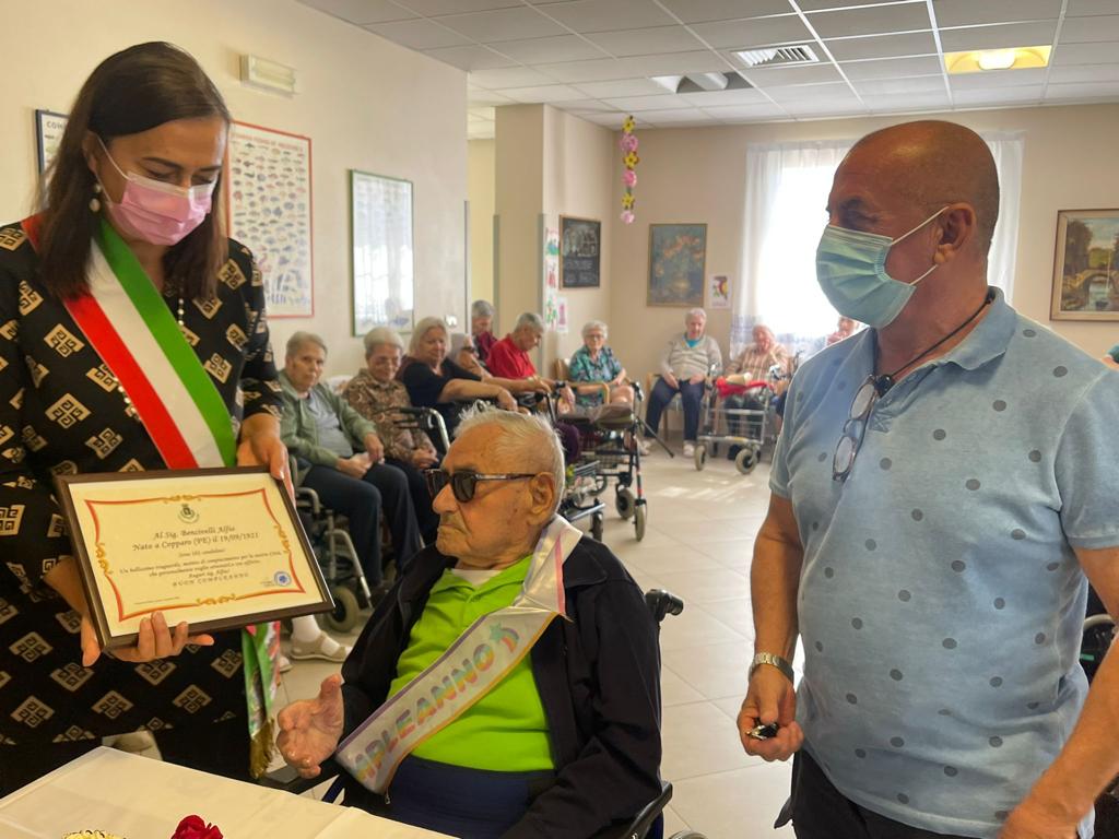 Speciale compleanno per Alfio Bencivelli che nei giorni scorsi ha festeggiato i 102 anni d'età nella casa di riposo Villa Fattori di Castel San Pietro Terme, circondato dall'affetto di familiari, responsabili, operatori e ospiti della struttura. A farle gli auguri è giunta anche l'assessora Barbara Mezzetti che gli ha donato una targa con gli auguri da parte del sindaco Fausto Tinti e di tutta la cittadinanza di Castel San Pietro Terme. «Sono 102 candeline! Un bellissimo traguardo, motivo di compiacimento per la nostra Città, che personalmente voglio attestarle con affetto. Auguri sig. Alfio! Buon compleanno»: è il messaggio augurale del sindaco Fausto Tinti.