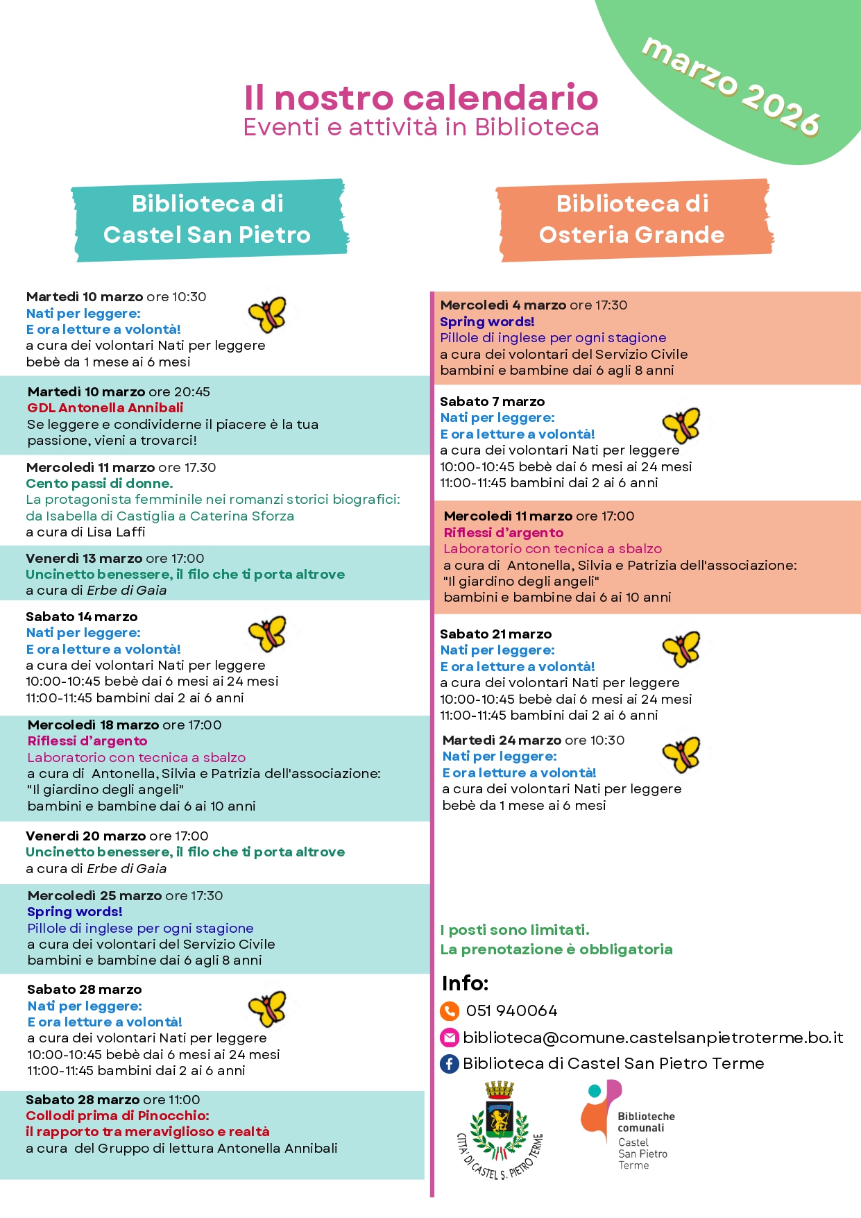 Le Biblioteche Comunali di Castel San Pietro Terme e Osteria Grande propongono per il mese di marzo un ricco calendario di appuntamenti per tutti: dalle letture per i più piccoli ai laboratori creativi, dagli incontri culturali al gruppo di lettura, passando per attività in lingua inglese e momenti di benessere e socialità.