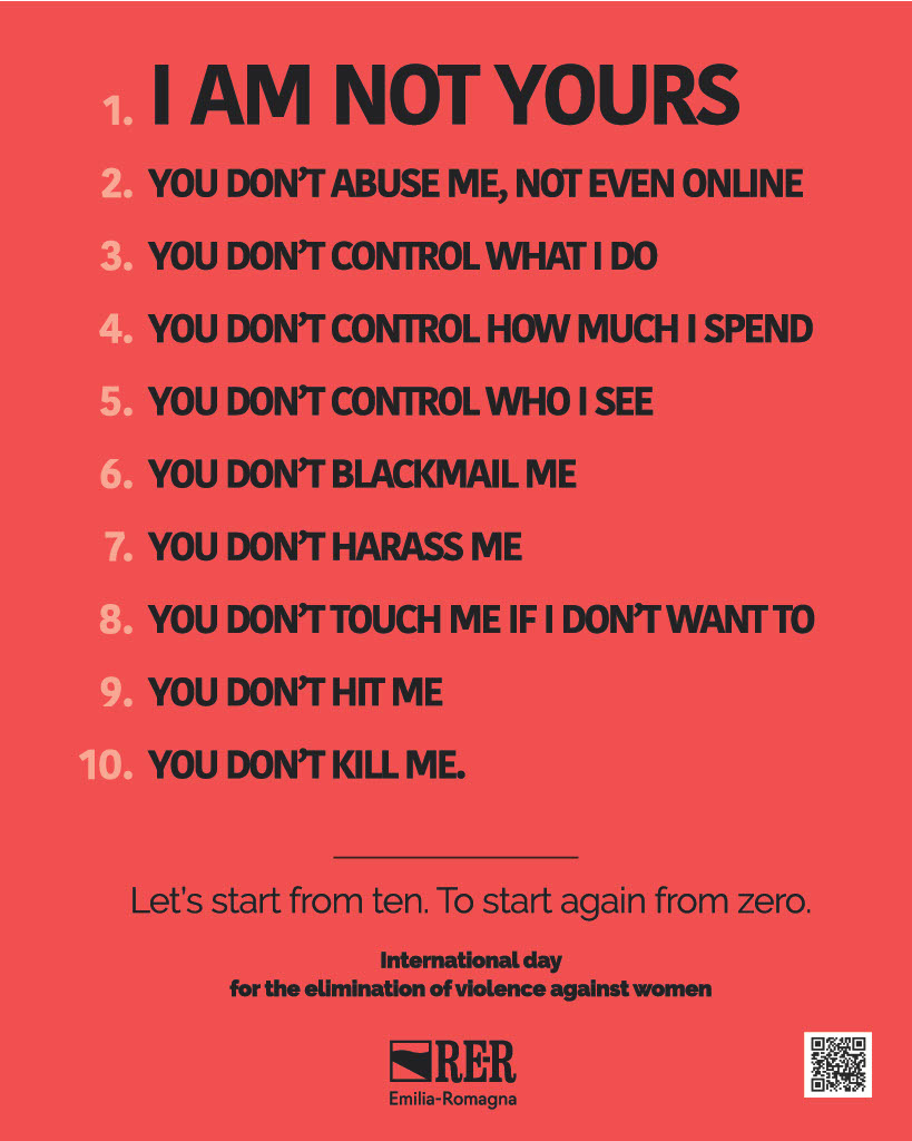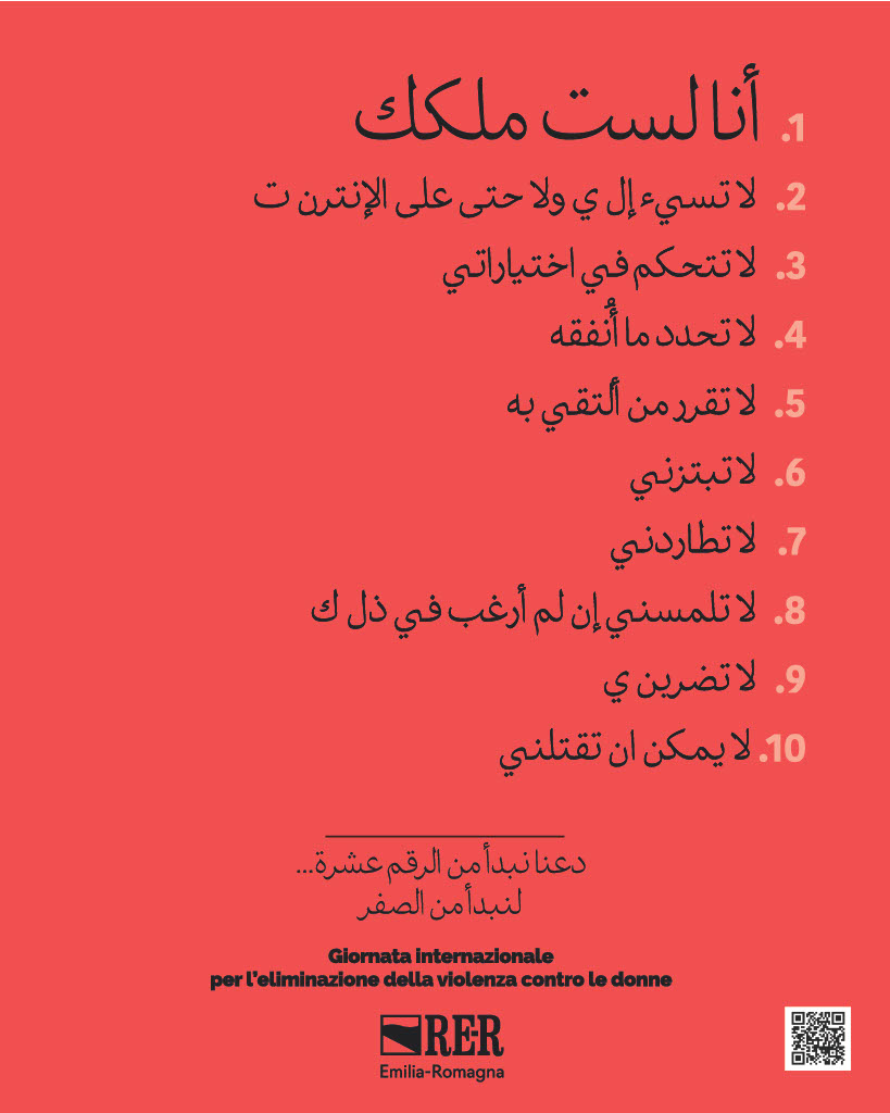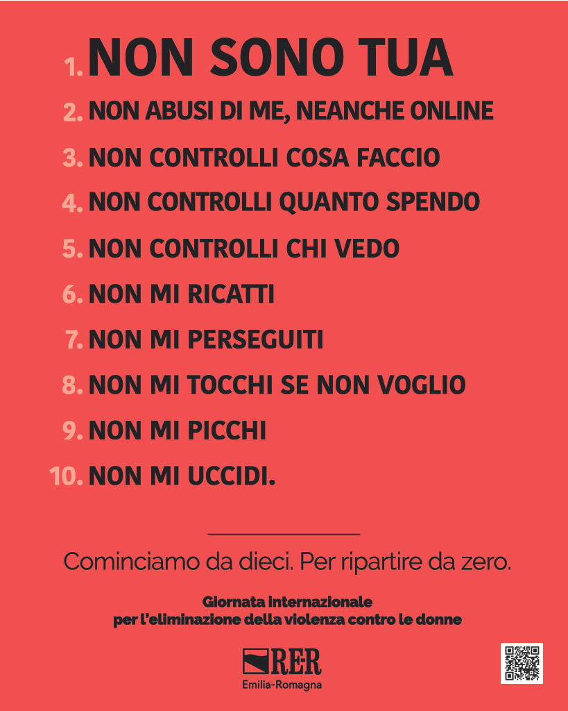 La nuova campagna di comunicazione realizzata dalla Regione per il 25 novembre, Giornata internazionale per l’eliminazione della violenza contro le donne, parla in italiano, inglese, arabo, francese, e spagnolo. È un coro di ‘NO’, è un decalogo di divieti dove il numero 1 è il principio fondamentale da cui discendono tutti gli altri: ‘Non sono tua’.