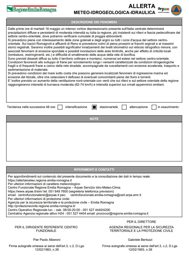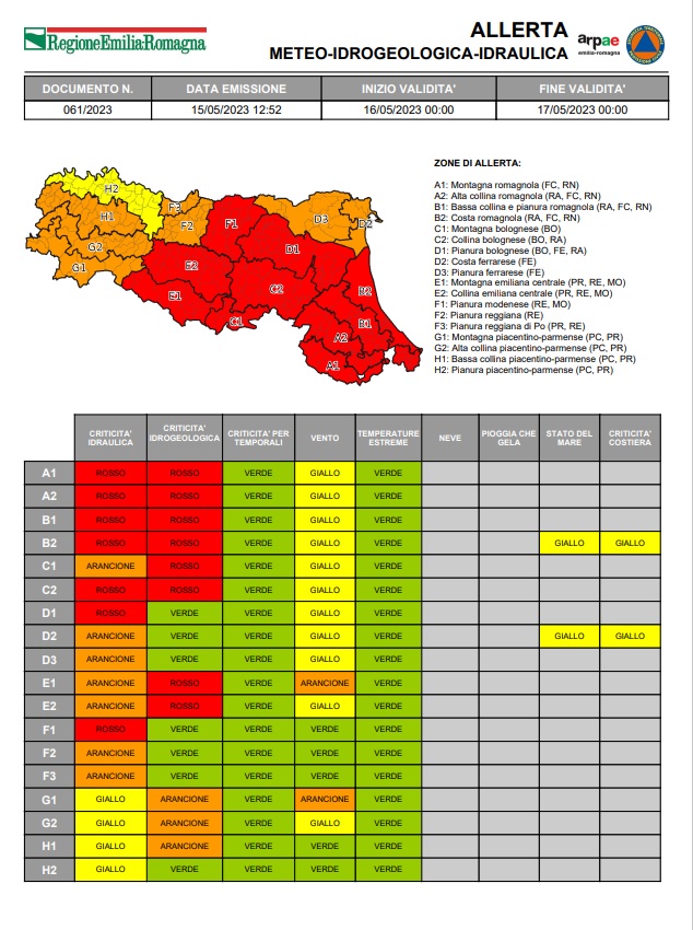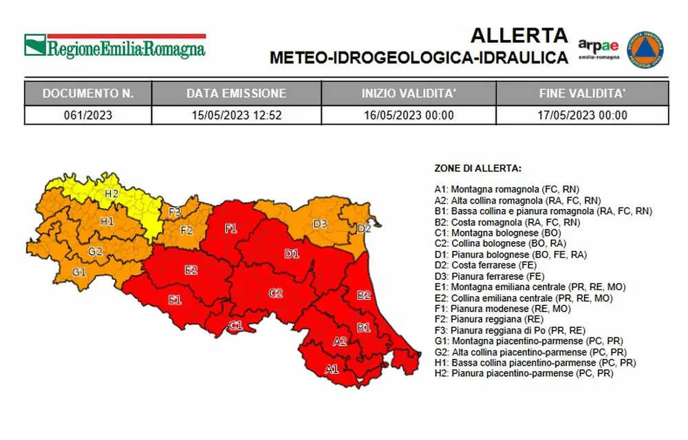 Per la giornata di martedì 16 maggio la protezione civile regionale ha emanato un'allerta rossa per rischio idraulico e idrogeologico nella zona che comprende il Comune di Castel San Pietro Terme (C2). Info: https://allertameteo.regione.emilia-romagna.it/