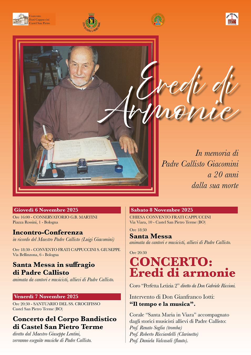 A vent’anni dalla morte di Padre Callisto Giacomini, religioso cappuccino e musicista di grande rilievo per la vita culturale e spirituale dell’Emilia-Romagna, si terranno tre giornate di commemorazione tra Bologna e Castel San Pietro Terme, nei giorni 6, 7 e 8 novembre 2025, con il patrocinio del Comune e di ProLoco.